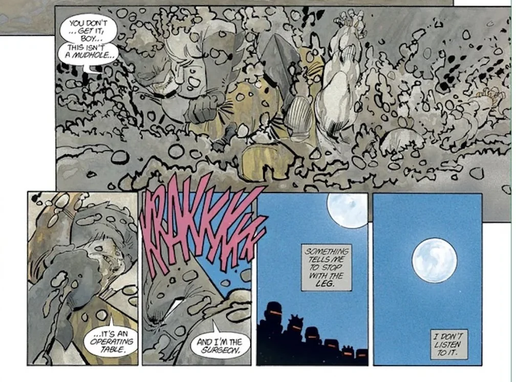 The chapter ends with a bloody, gruesome battle between Batman and the Mutant leader in a mud pit, complete with the over-the-top violence for which Miller has become famous: