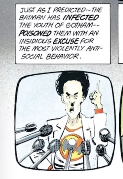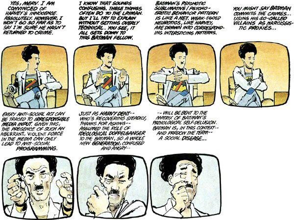 In one of the many television broadcasts punctuating the chapter, Harvey Dent's psychiatrist, Dr. Bartholomew Wolper, explains that Batman is himself responsible for all the crimes he fights, thanks to his anti-social actions being popularized by the media. Wolper (who, among other things, is an obvious parody of anti-comics crusader Dr. Frederic Wertham), is a proponent of the outdated "media effects" theory, which presumes passivity and vulnerability on the part of the media consumer: