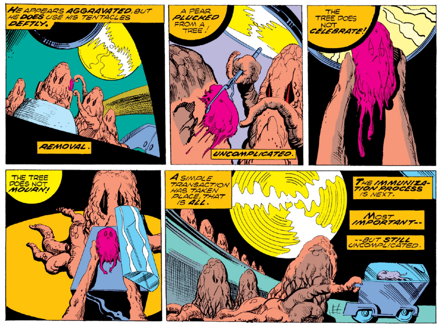 Red Dust Legacy echoes the earlier “Deathbirth” storyline (27-29, 31) about the breeding of human babies as Martian food. Not only was that the setting for Killraven’s discovery that his clairsentience is a connection specifically to Martians, but the contrast between the melodramatic, pathos-infused tale of young parents-to-be and the dispassionate reproduction of the Martians is effective. The “Eve” of “Deathbirth” goes through a painful labor that never distracts her from her love of the baby about to be born, while the parturition among the asexual Martians is simply a “removal”:
