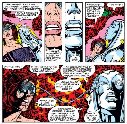 Ultron's scheme here does what he always does, but on a larger scale, bringing together this Oedipal anxieties with Pym's identity crises and inferiority complex in order by externalizing his "father's" endless proliferation of identities onto other, newly created beings. Hank Pym, childless (at least until a twenty-first century retcon), plagued by feelings of inadequacy, can only resort to the same tactic again and again: treating his very self as a canvas onto which to paint a new facade. Ultron may also engage in continually self-improvement (he has only just abandoned calling himself "Ultron 5," or "Ultron 7," as if he were a new version of a popular sports car), but what he really excels at is creating new, artificial lives. If the Vision was the rebellious son, now he will use the brain patterns of the kidnapped Janet Pym and the scientific genius of her addled husband to create a wife for himself, a robotic bride given the very on-the-nose name of Jocasta. Jocasta, like nearly all of Ultron's creations, rebels, allying with the Avengers and existing on the margins of the Marvel Universe for the next several decades. But all of this can be considered the extensions of Hank Pym's messy psyche. And if Jocasta is a robotic version of Jan, her rebellion is also a warning: Hank cannot control her.