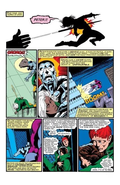 Uncanny X-Men 202 takes its title from Rachel's declaration to her teammates: "X-Men......I've Gone to Kill the Beyonder!" She does not succeed, of course, but she gets a power boost from the Beyonder himself, which, in the next issue, inspires her to seek more power in order to....destroy the universe. That will also being about the death of the Beyonder, and leave a Beyonder-less universe for the people who will somehow come after. This argument defies logic, but so does the entire issue: half the X-Men freely surrender their life energy to Rachel in order to give her a fighting chance. Where the original Phoenix used her teammates life energies (sparingly!) to help her stop the universe's destruction resulting from a flaw in the M'Kraan Crystal, Rachel (accompanied by the spirits of her friends) makes her way inot the Crystal in order to release the very threat that her mother had tamed. Instead, she briefly becomes one with the universe, realizes she cannot bring herself to destroy all reality, and then shares the experience with the Beyonder so that he will value life as well.