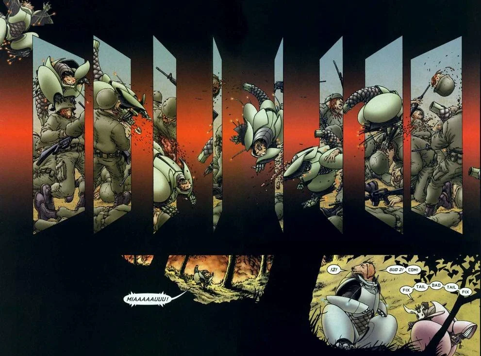 To cope with Watchmen, Morrison must swallow it whole. To do so, he creates Pax Americana with one of his best collaborators, the artist Frank Quitely. In comics such as We3, Quitely brought artistic innovations to match and even surpass Morrison’s writerly flights of fancy, such as in this two-page spread showing the cyborg animal protagonists seeming to move though the very materiality of the comics page as they rip apart the soldiers who have attacked them: