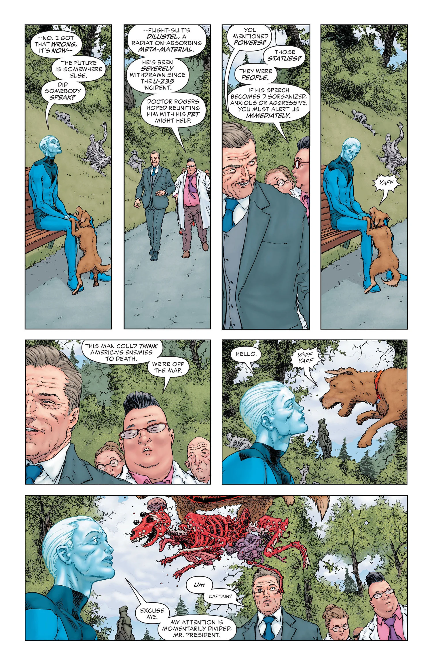 Watchmen and its variations each incorporates its own theory of physics: simultaneity for Watchmen, quantum physics and the superposition for Straczynski’s Dr. Manhattan series in the Before Watchmen project, and now Morrison gives us a comic whose initial accomplishment is the reversal of entropy. The entire comic revolves around various instances and promises of countermanding the Second Law of Thermodynamics: Captain Adam disintegrates his dog, only to rebuild him bit by bit (“It’s hard to love the pieces"), while the president arranges his own assassination in the belief that the Captain will do the same for him.